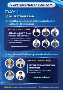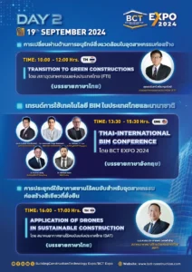 Building Construction Technology Expo (BCT EXPO) งานแสดงสินค้าเจรจาธุรกิจอุตสาหกรรมอาคารและการก่อสร้าง นำเสนอทุกด้านในอุตสาหกรรมอาคารและการก่อสร้างแบบครบวงจรรวบรวมบริษัทด้านเครื่องจักร อุปกรณ์ เครื่องมือ การบริหารจัดการอาคารอัจฉริยะ เทคโนโลยีแบบจำลองสารสนเทศอาคาร (BIM) ปัญญาประดิษฐ์และหุ่นยนต์ (AI & Robotics) โดรน รวมไปถึงโซลูชันและการบริการที่ครอบคลุมทุกแง่มุมของอุตสาหกรรมอาคารและการก่อสร้างทุกประเภท พร้อมพบกับผู้ประกอบการในอุตสาหกรรมกว่า 150 บริษัท และเชื่อมต่อกับผู้ซื้อและผู้เชี่ยวชาญในอุตสาหกรรมกว่า 4,000 ราย จัดขึ้นระหว่างวันที่ วันที่ 18-20 กันยายน 2024 ณ อาคาร 12 ศูนย์แสดงสินค้าและการประชุม อิมแพ็ค เมืองทองธานี